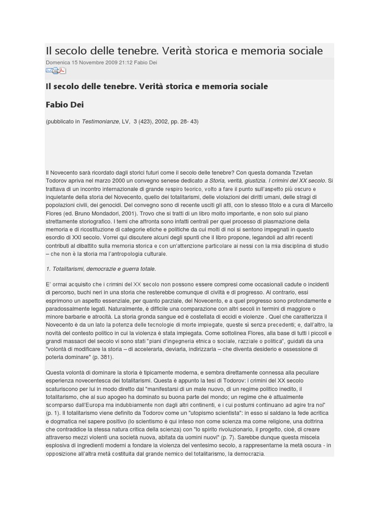 Todorov apriva nel marzo 2000 un convegno senese dedicato a Storia, verità, giustizia. I crimini del XX secolo. Si