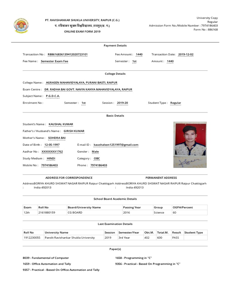 पं. रिवशंकर शु िव िव ालय ,रायपुर(छ. ग.) Admission Form No./Mobile Number : 7974186403