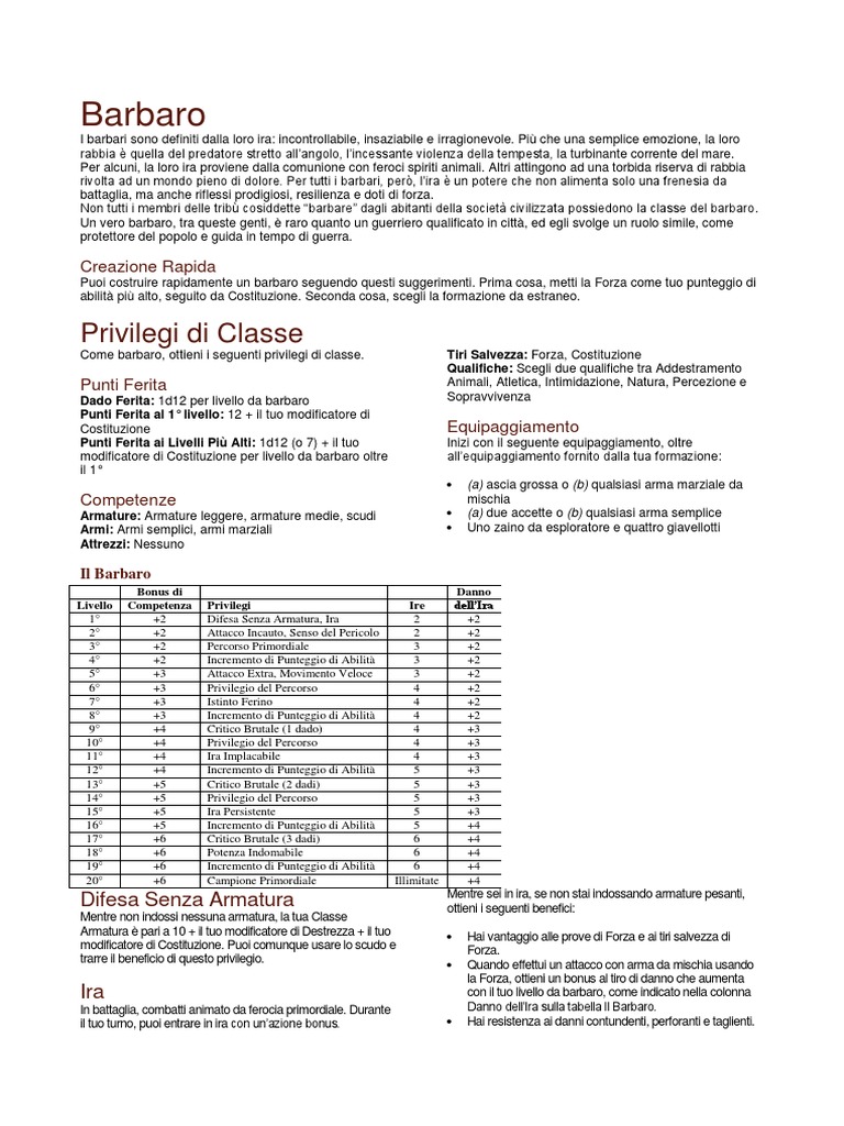 Come barbaro, ottieni i seguenti privilegi di classe. Tiri Salvezza: Forza, Costituzione