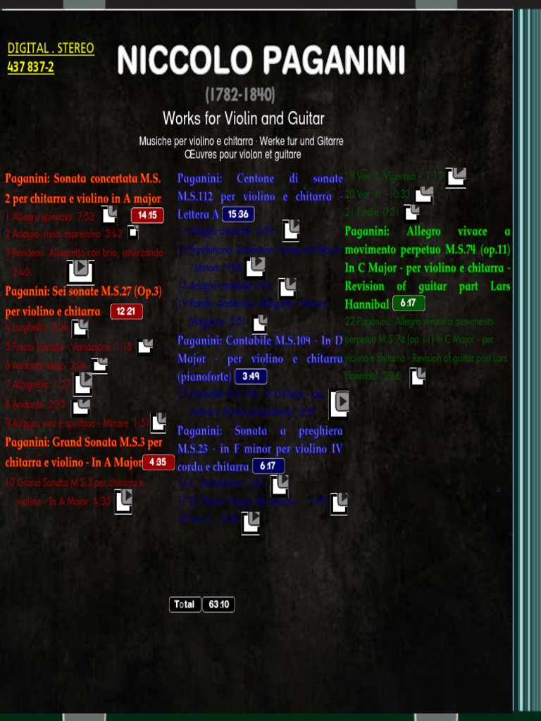 Paganini: Sei sonate M.S.27 (Op.3) 13 Adagio cantabile 2:43 Revision of guitar part Lars