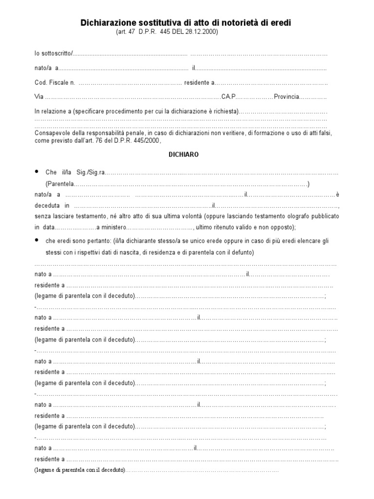 Dichiarazione sostitutiva di atto di notorietà di eredi