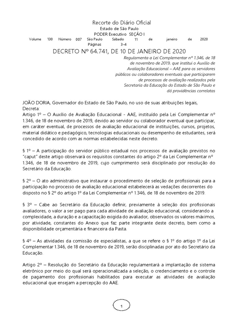 DECRETO Nº 64.741, DE 10 DE JANEIRO DE 2020