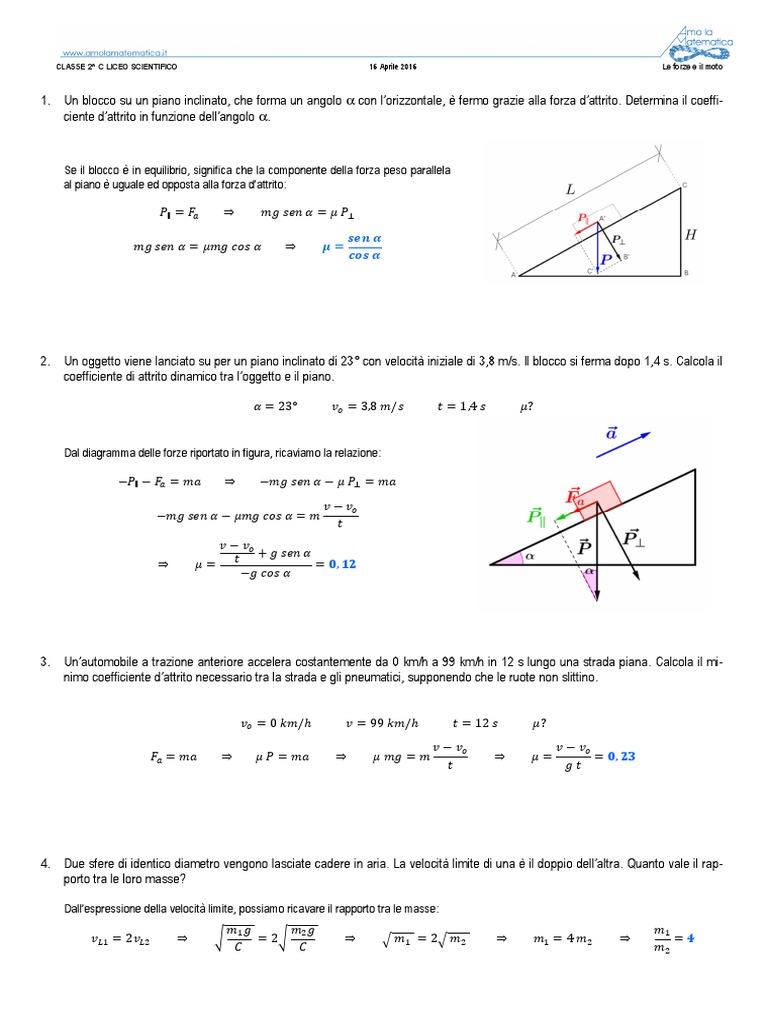1. Un blocco su un piano inclinato, che forma un angolo α con l’orizzontale, è fermo grazie alla forza d’attrito. Determina il coeffi-