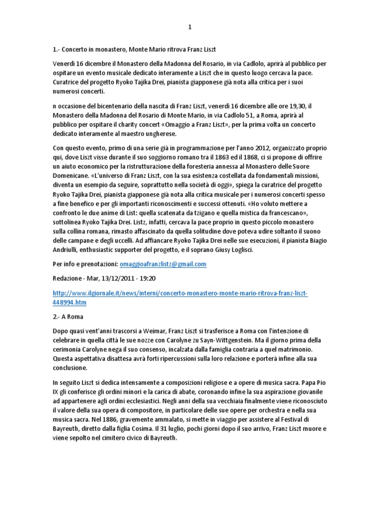 1.- Concerto in monastero, Monte Mario ritrova Franz Liszt