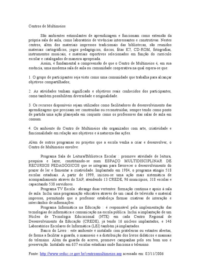 Fonte: http://www.seduc.ce.gov.br/centrosmultimeios.asp acessado em: 02/11/2006