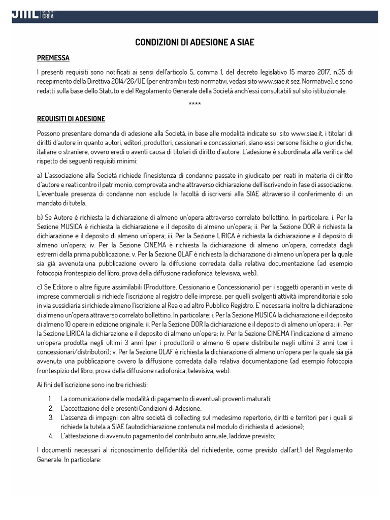 L’iscrizione a SIAE comporta il conferimento alla stessa del mandato per l’intermediazione in via esclusiva del