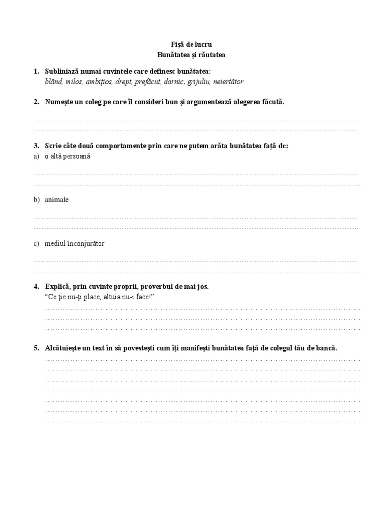 5. Alcǎtuieşte un text în sǎ povesteşti cum îţi manifeşti bunǎtatea faţǎ de colegul tǎu de bancǎ.