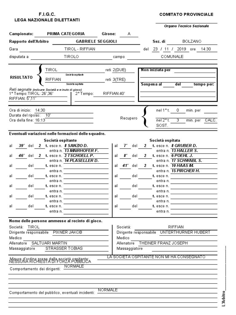 Rapporto dell'Arbitro GABRIELE SEGGIOLI Sez. di BOLZANO