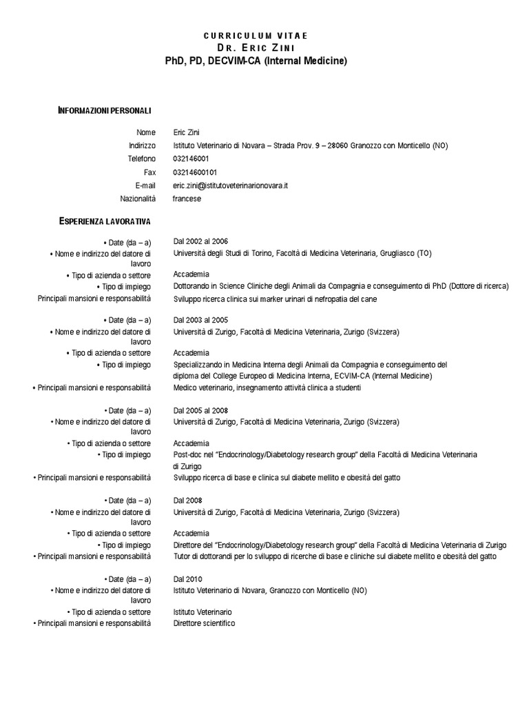 • Tipo di impiego Direttore del “Endocrinology/Diabetology research group” della Facoltà di Medicina Veterinaria di Zurigo