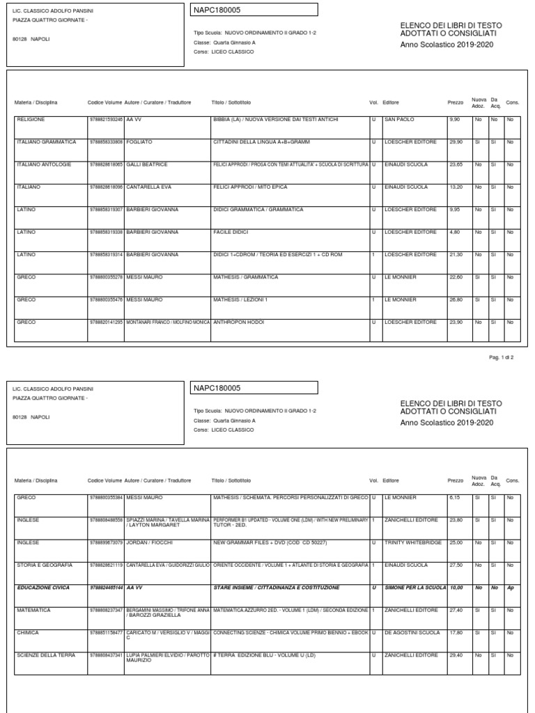 Tipo Scuola: NUOVO ORDINAMENTO II GRADO 1-2 ADOTTATI O CONSIGLIATI