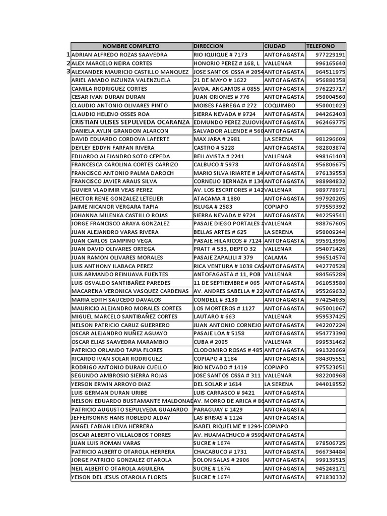 1 ADRIAN ALFREDO ROZAS SAAVEDRA RIO IQUIQUE # 7173 ANTOFAGASTA 977229191