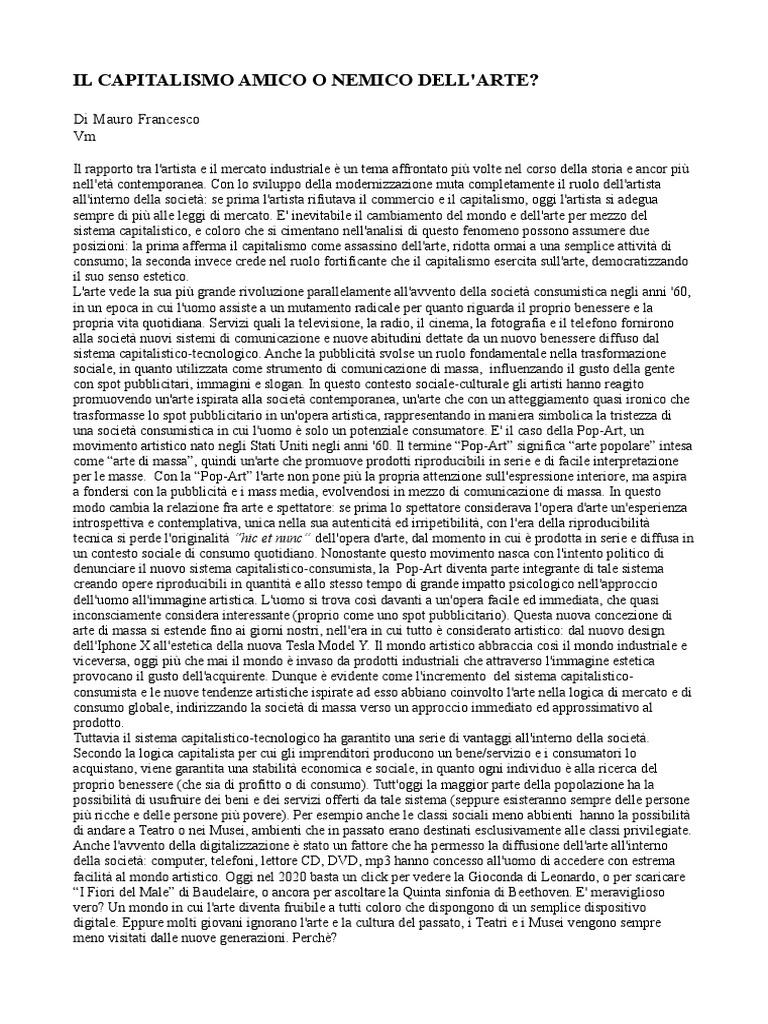IL CAPITALISMO AMICO O NEMICO DELL'ARTE?