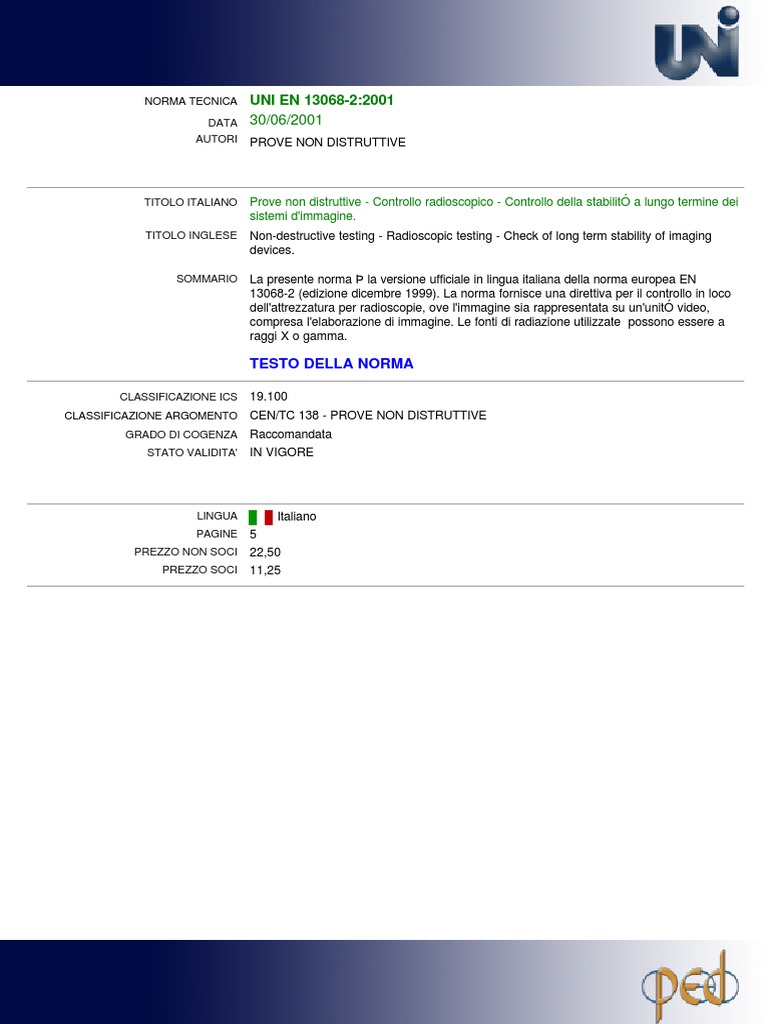 UNI EN 13068-2:2001 - 30-06-2001 - Prove non distruttive - Controllo radioscopico - Controllo della stabilitÓ a lungo termine dei sistemi d'immagine. - Non-destructive testing - Radioscopic testing - Check of long term