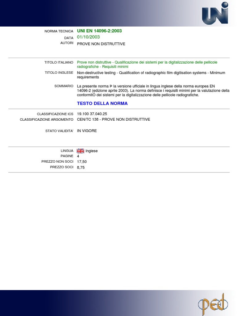 TITOLO INGLESE Non-destructive testing - Qualification of radiographic film digitisation systems - Minimum