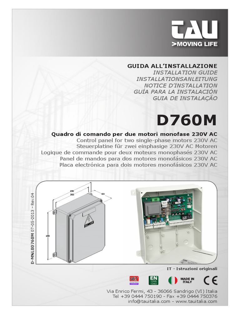 The D760M control unit ensures safety by requiring installation and service to be performed by qualified personnel, adhering to applicable standards and conducting a thorough risk analysis before installation. Compliance with the Machinery Directive 2006/42/EC mandates proper installation, risk analysis, and issuing a declaration of conformity to the machine owner. The control unit features an electronic safety check on the photocell transmitter, blocking the unit if the relay does not switch correctly .