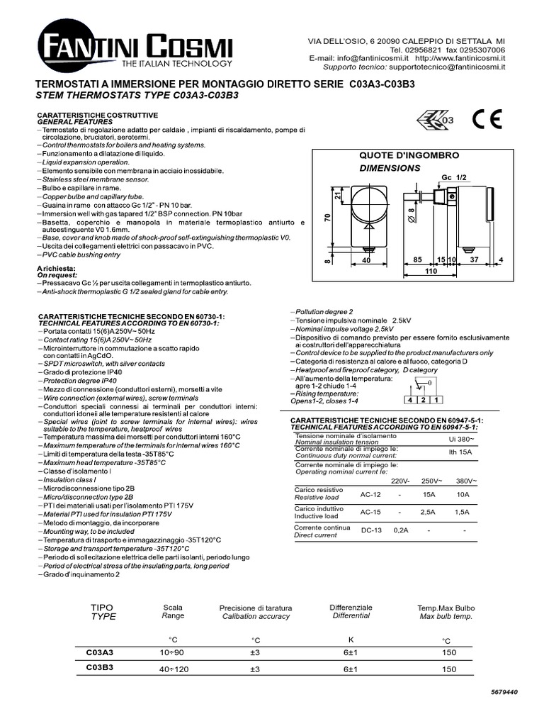TERMOSTATI A IMMERSIONE PER MONTAGGIO DIRETTO SERIE C03A3-C03B3