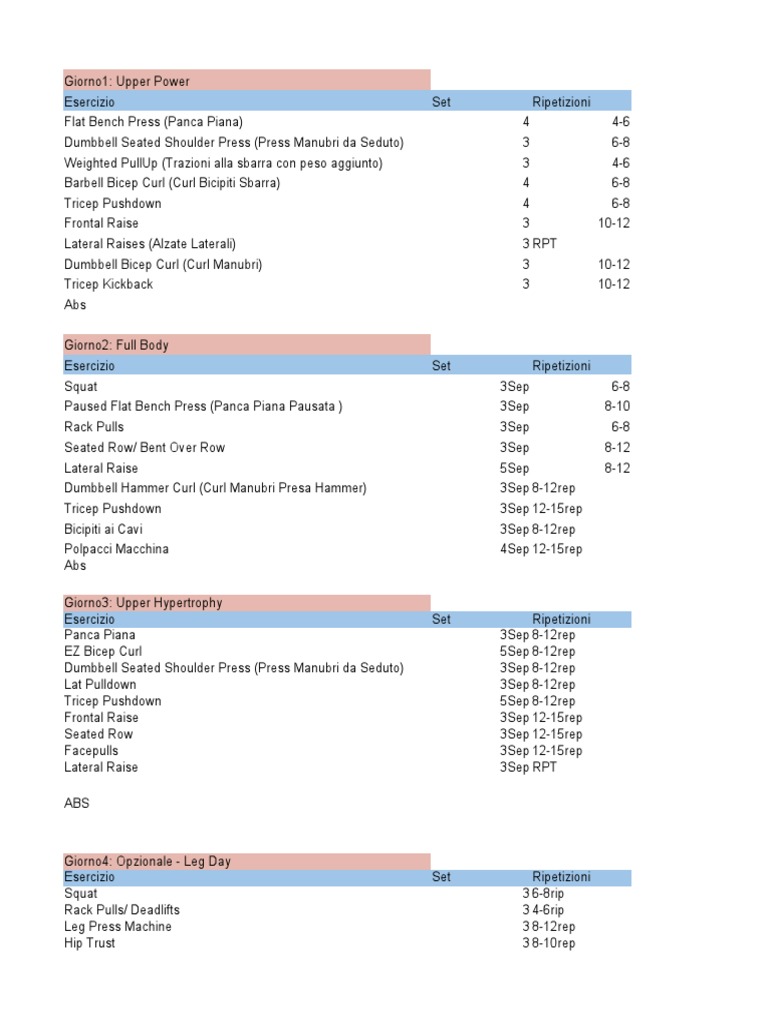 bilita' di includere 1 full leg day come quarto giorno opzionale.