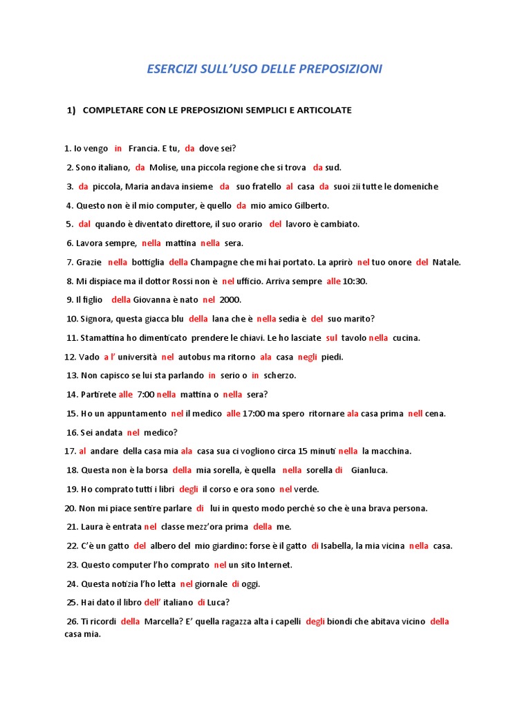 1) COMPLETARE CON LE PREPOSIZIONI SEMPLICI E ARTICOLATE