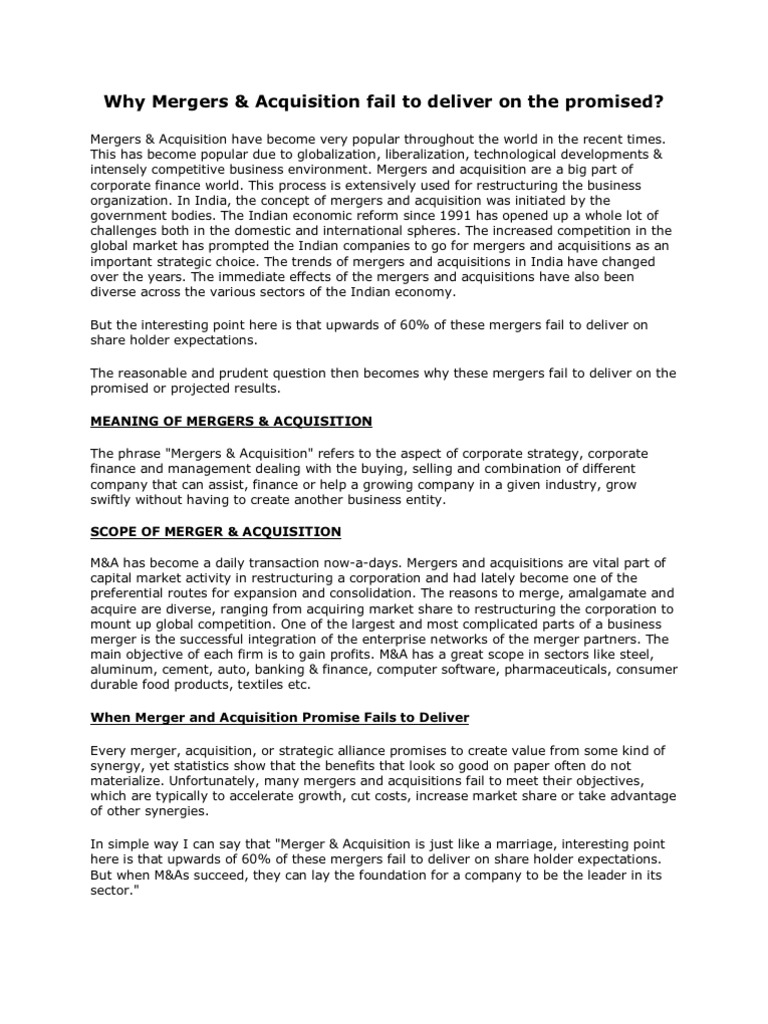 Mergers & Acquisition have become very popular throughout the world in the recent times.