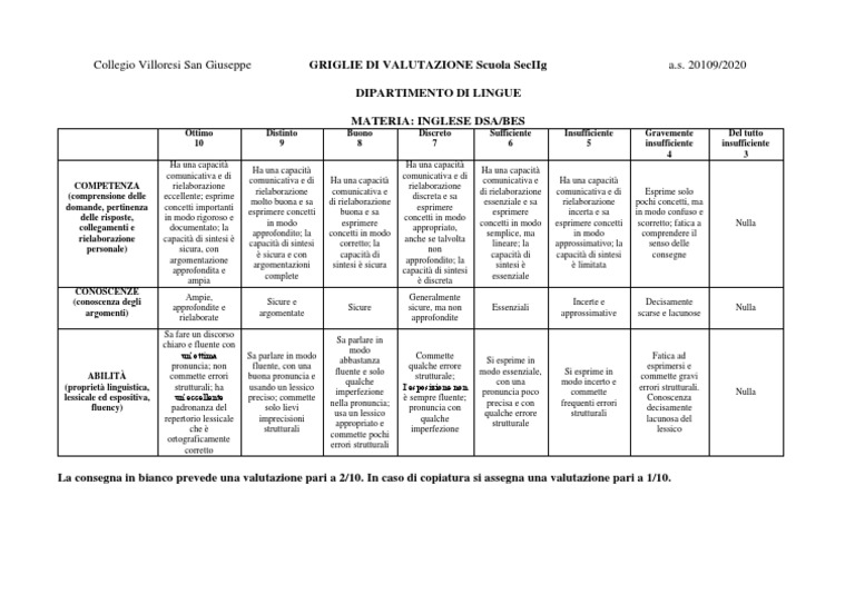Collegio Villoresi San Giuseppe GRIGLIE DI VALUTAZIONE Scuola SecIIg a.s.