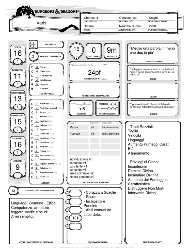 NOME PERSONAGGIO RAZZA ALLINEAMENTO PUNTI ESPERIENZA