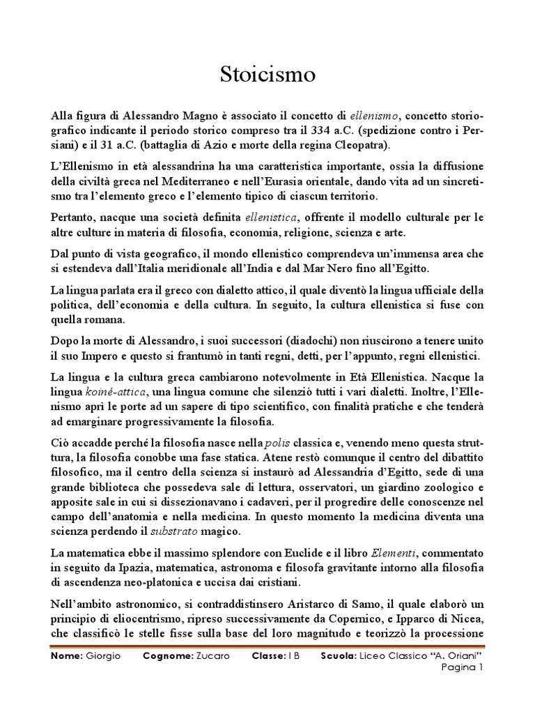Lo Stoicismo fu fondato da Zenone di Cizio e in seguito da Cleante e da Crisippo, il