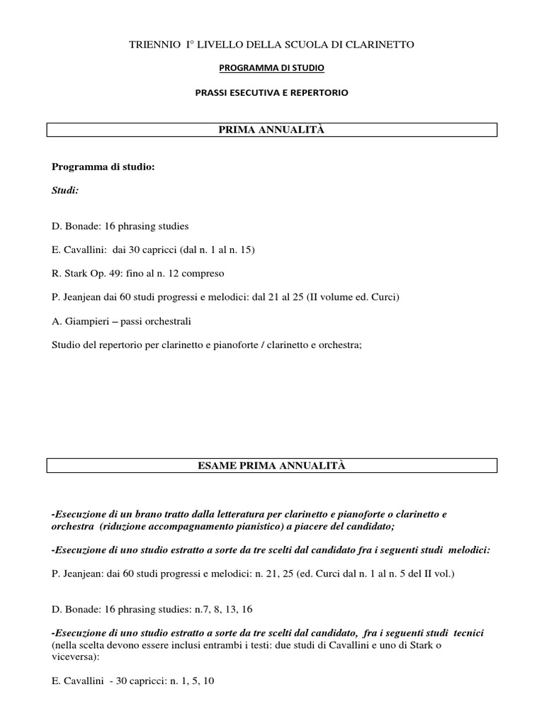 TRIENNIO I° LIVELLO DELLA SCUOLA DI CLARINETTO