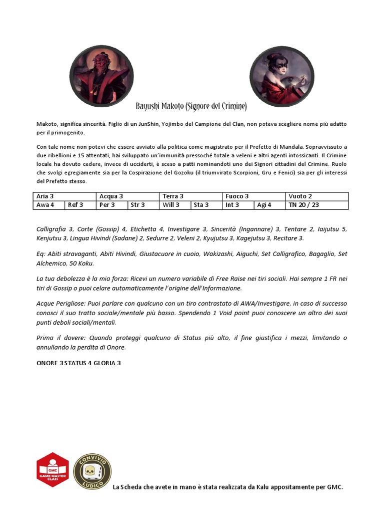 Calligrafia 3, Corte (Gossip) 4, Etichetta 4, Investigare 3, Sincerità (Ingannare) 3, Tentare 2, Iaijutsu 5,