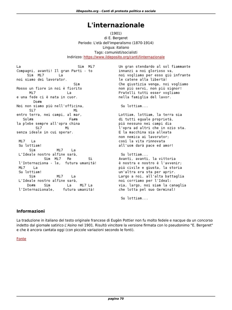 La traduzione in italiano del testo originale francese di Eugèn Pottier non fu molto fedele e nacque da un concorso