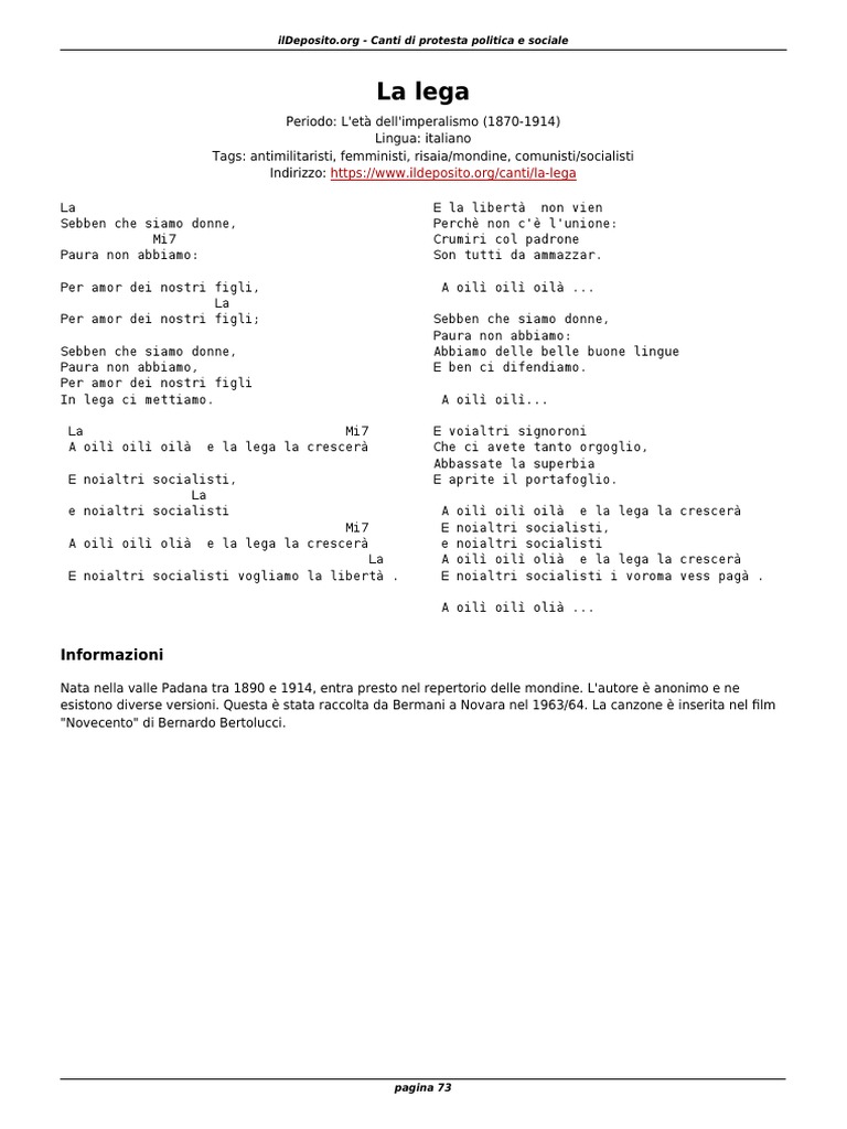 esistono diverse versioni. Questa è stata raccolta da Bermani a Novara nel 1963/64. La canzone è inserita nel film
