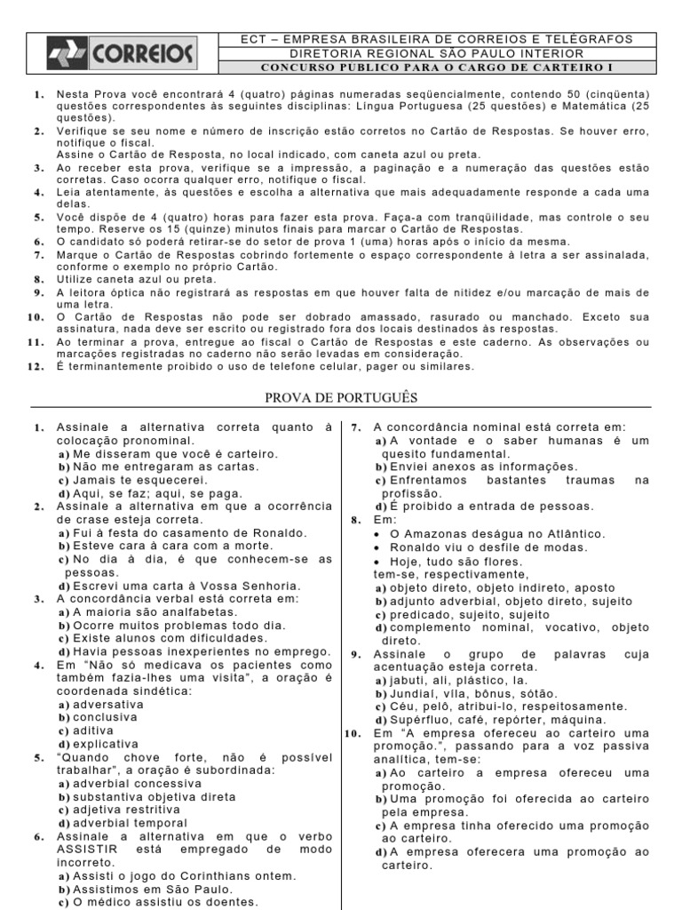 questões correspondentes às seguintes disciplinas: Língua Portuguesa (25 questões) e Matemática (25