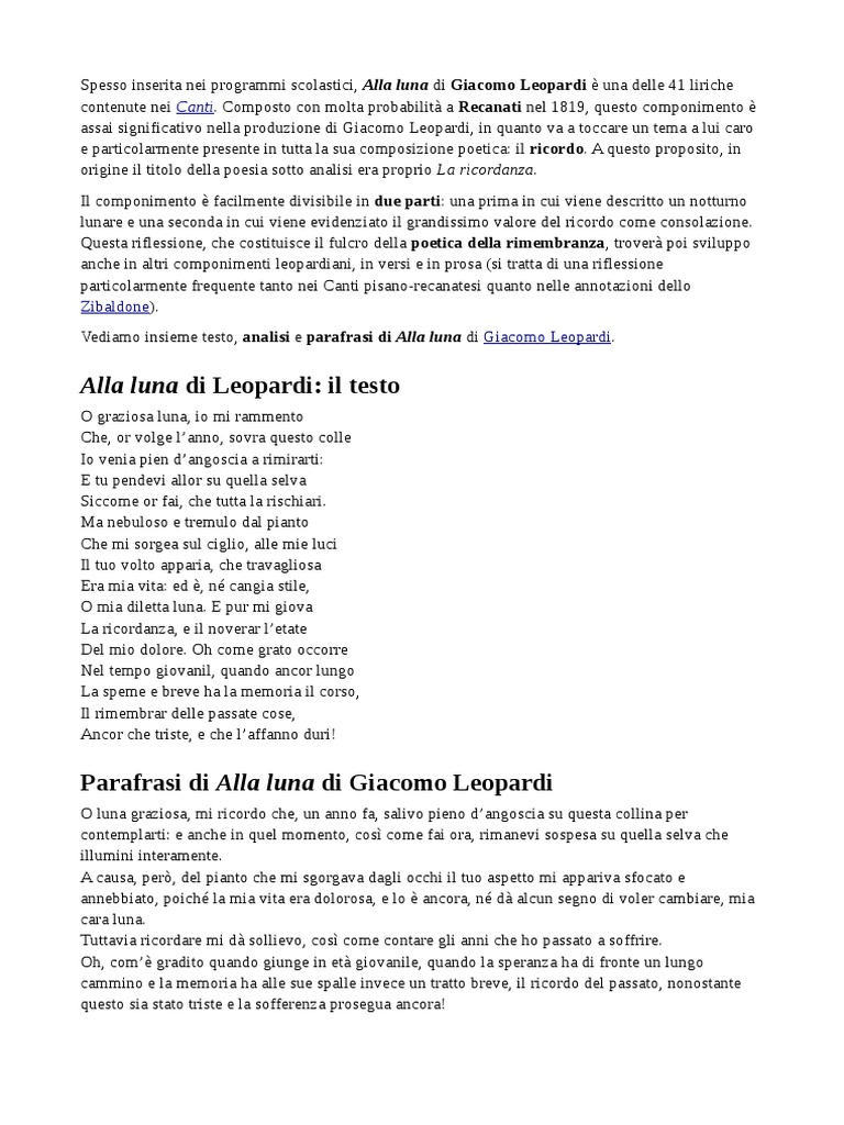 Alla luna è un componimento scritto da Leopardi attorno al 1819 e inserito nell’edizione dei Canti