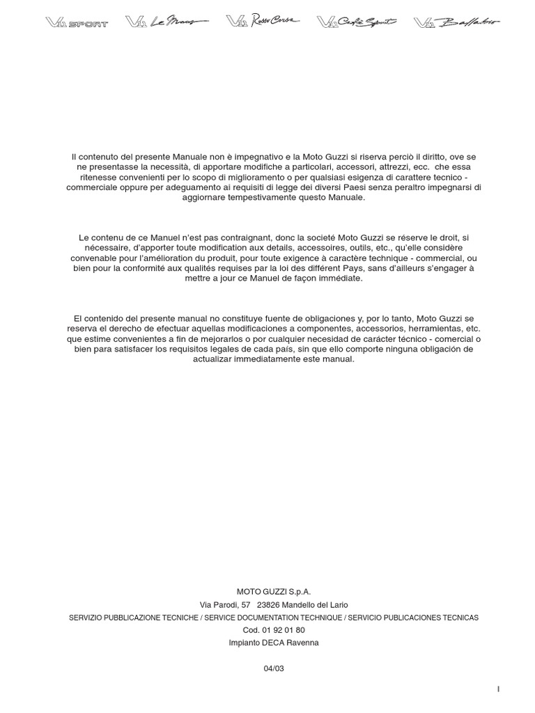 Le contenu de ce Manuel n’est pas contraignant, donc la societé Moto Guzzi se réserve le droit, si
