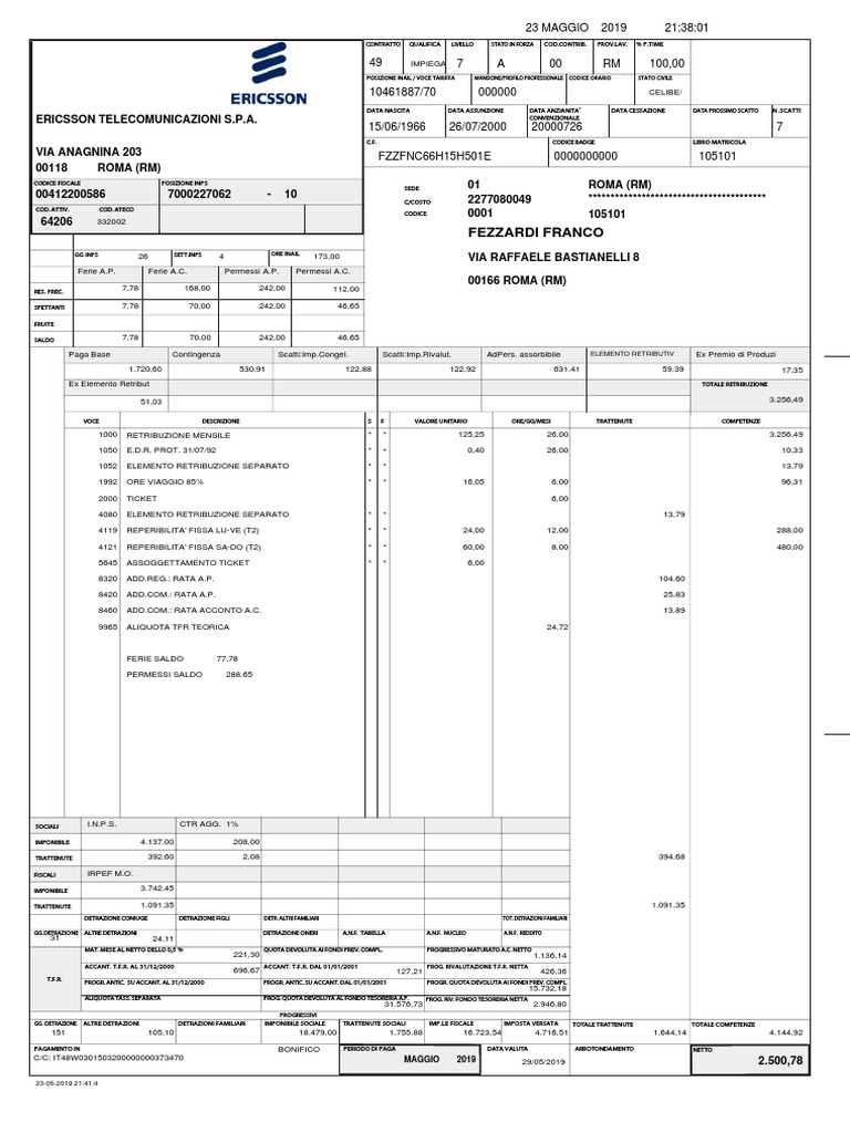 C/C: IT48W0301503200000000373470 MAGGIO 2019 29/05/2019 2.500,78