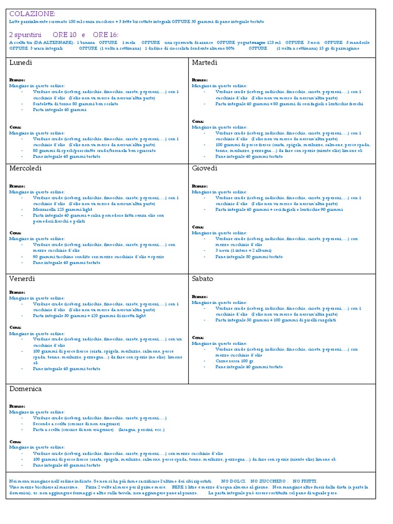 Nei menu mangiare nell’ordine indicato. Se non si ha più fame sacrificare l’ultimo dei cibi riportati. NO DOLCI. NO ZUCCHERO . NO FRITTI.