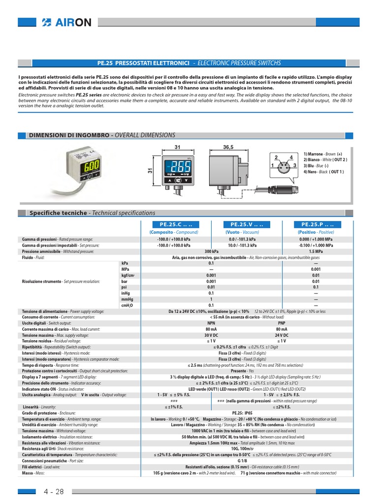 Electronic pressure switches PE.25 series are electronic devices to check air pressure in a easy and fast way. The wide display shows the selected functions, the choice