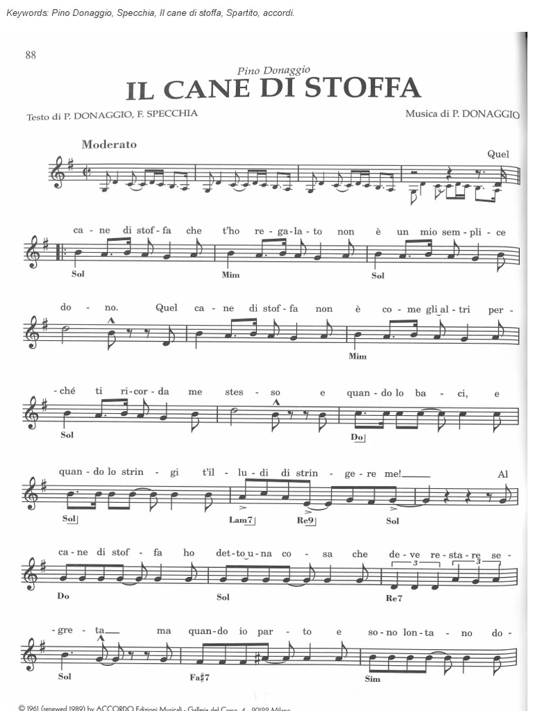 Keywords: Pino Donaggio, Specchia, Il cane di stoffa, Spartito, accordi.