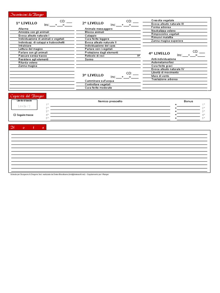 Scheda per Dungeons & Dragons 3ed. realizzata da Drake Bloodbane (dnd@[Link]) – Supplemento per i Ranger