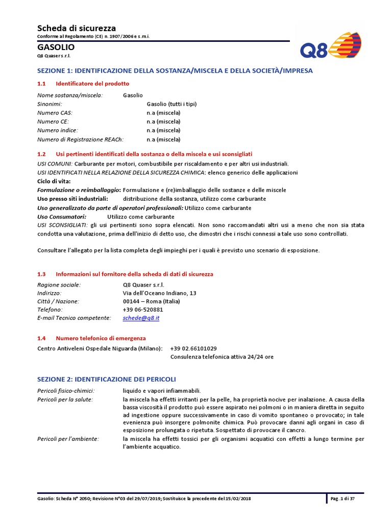 Gasolio: Scheda N° 2050; Revisione N°03 del 29/07/2019; Sostituisce la precedente del 15/02/2018 Pag. 2 di 37