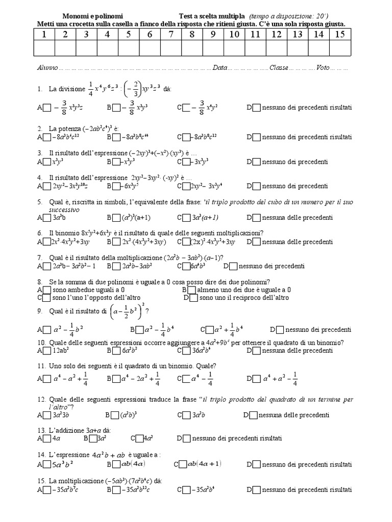 Monomi e polinomi Test a scelta multipla (tempo a disposizione: 20’)