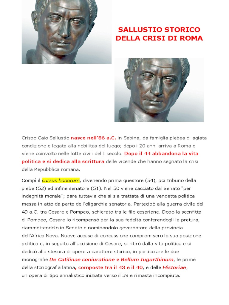 Crispo Caio Sallustio nasce nell’86 a.C. in Sabina, da famiglia plebea di agiata