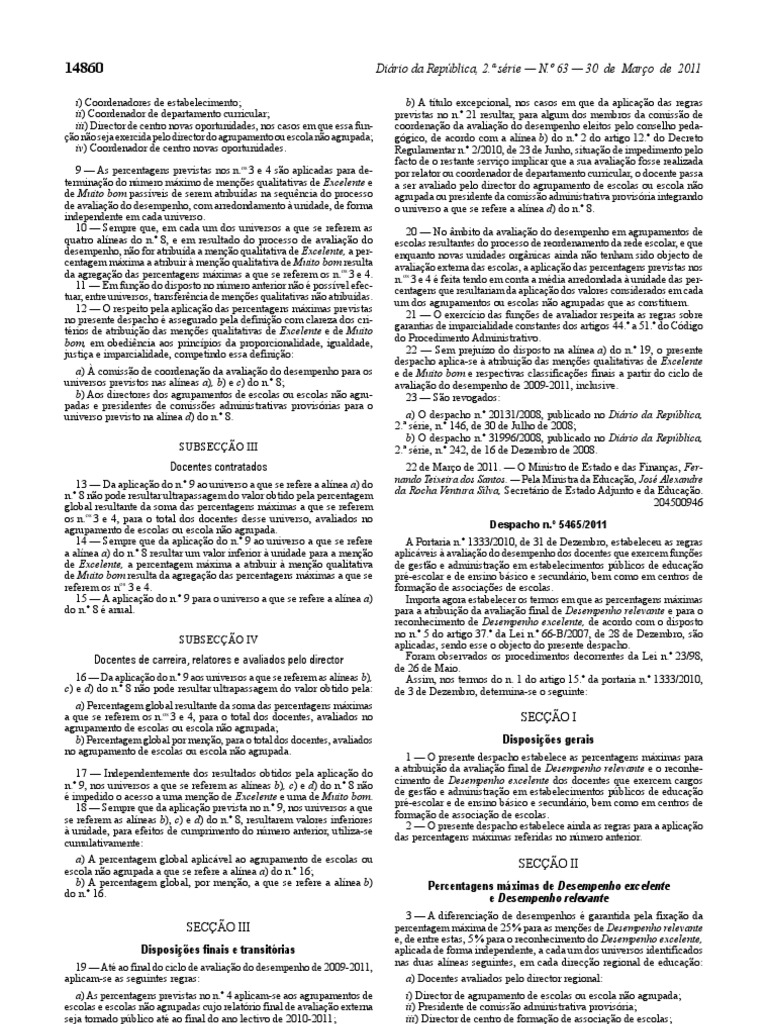 A Portaria n.º 1333/2010, de 31 de Dezembro, estabeleceu as regras aplicáveis à avaliação do desempenho dos docentes que exercem funções de gestão e administração em estabelecimentos públicos de educação pré-escolar e de ensino básico e secundário, bem como em centros de formação de associações de escolas. Importa agora estabelecer os termos em que as percentagens máximas para a atribuição da avaliação final de Desempenho relevante e para o reconhecimento de Desempenho excelente, de acordo com o disposto no n.º 5 do artigo 37.º da Lei n.º 66-B/2007, de 28 de Dezembro, são aplicadas, sendo esse o objecto do presente despacho. Foram observados os procedimentos decorrentes da Lei n.º 23/98, de 26 de Maio. Assim, nos termos do n. 1 do artigo 15.º da portaria n.º 1333/2010, de 3 de Dezembro, determina-se o seguinte: