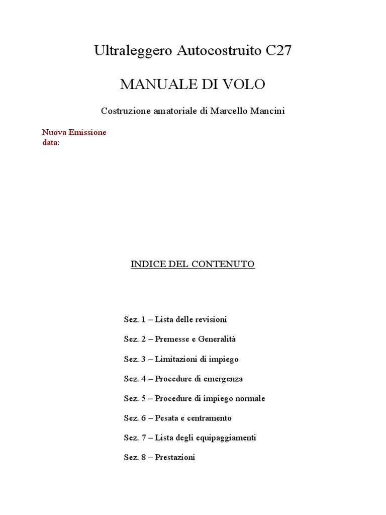 Il presente manuale di volo non ha l'approvazione di alcuna Autorità, tuttavia il
