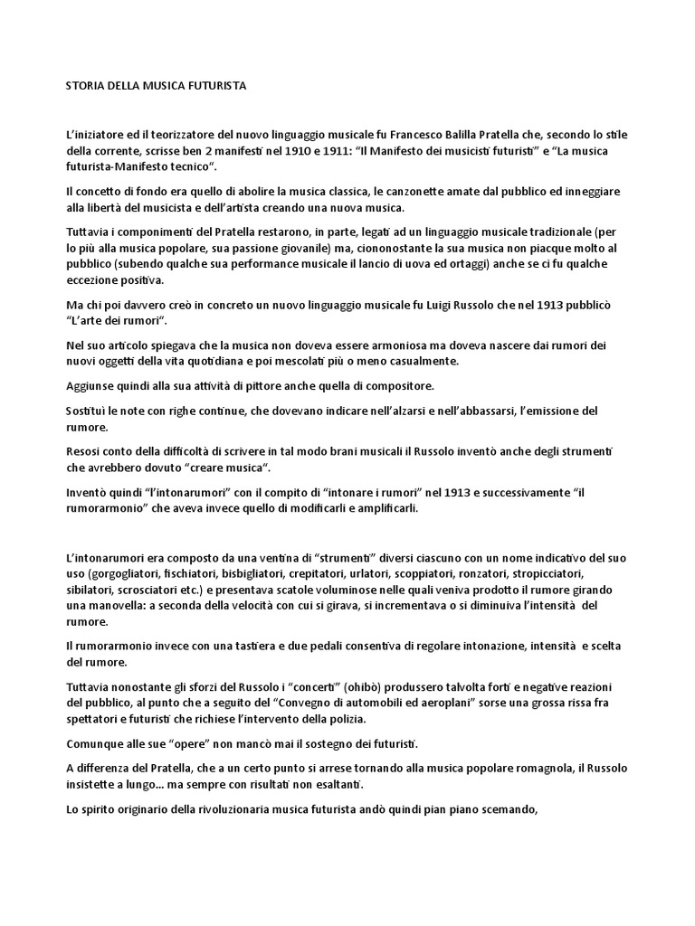 della corrente, scrisse ben 2 manifesti nel 1910 e 1911: “Il Manifesto dei musicisti futuristi” e “La musica