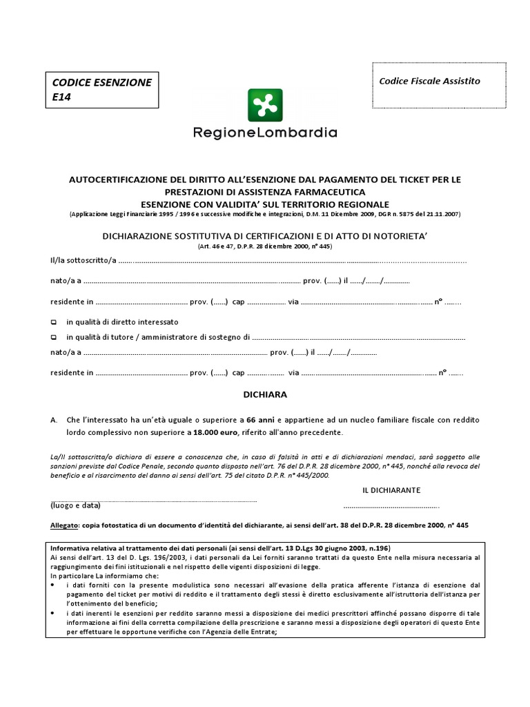 AUTOCERTIFICAZIONE DEL DIRITTO ALL’ESENZIONE DAL PAGAMENTO DEL TICKET PER LE