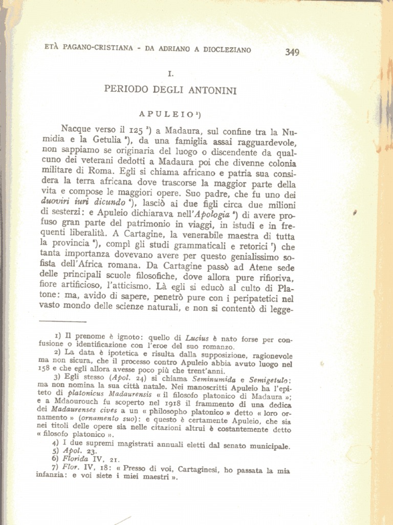 Nacque verso il 125 2) a Madaura, suI confine tra la Numidia e la Getulia '), da una famiglia assai ragguardevole, non sappiamo se originaria del luogo 0 discendente da qualcuno dei veterani dedotti a Madaura poi che divenne colonia militare di Roma. Egli si chiama africano e patria sua considera la terra africana dove trascorse la maggior parte della vita e compose le maggiori opere. Suo padre, che fu uno dei duouiri iuri dicundo '), lascio ai due figli circa due milioni di sesterzi : e Apuleio dichiarava nell' Apologia ') di avere profuso gran parte del patrimonio in viaggi, in istudi e in frequenti liberalita, A Cartagine, la venerabile maestra di tutta la provincia "), compi gli studi grammaticali e retorici ') che tanta importanza dovevano avere per questa genialissimo 50- fista dell' Africa romana. Da Cartagine passo ad Atene sede delle principali scuole filosofiche, dove allora pure rifioriva, fiore artificioso, l'atticismo. La egli si educe al culto di Platone: rna, avido di sapere, penetro pure con i peripatetici nel vasto mondo delle scienze naturali, e non si contento di legge-
