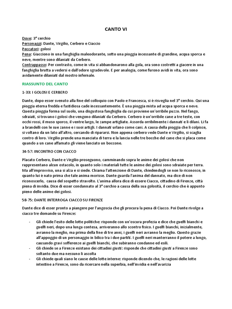 piena di invidia. Dice di esser condannato al 3° cerchio a causa della sua golosità, il cerchio che è appunto