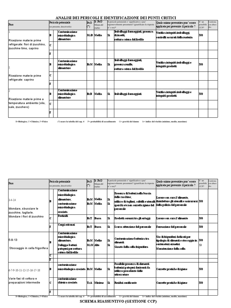 B=Biologico, C=Chimico, F=Fisico (°) usare la tabella del cap. 4 P= probabilità di accadimento G= gravità del danno Ir= indice del rischio (minimo, medio, massimo)