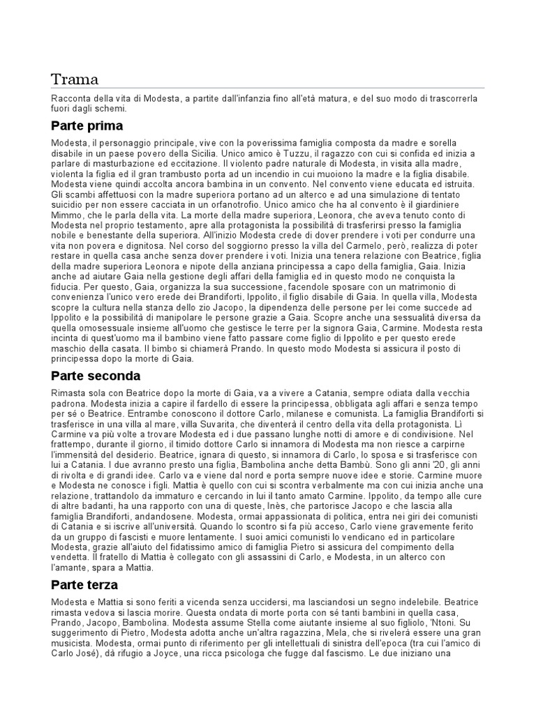 Racconta della vita di Modesta, a partite dall'infanzia fino all'età matura, e del suo modo di trascorrerla