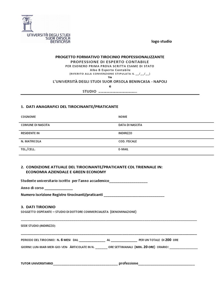 PERIODO DEL TIROCINIO: N. 6 MESI DAL _____________ AL _____________ PER UN TOTALE DI 200 ORE